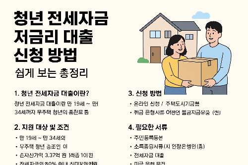 전세금 마련이 어려운 청년들을 위해 정부와 은행에서 제공하는 청년 전세자금 저금리 대출의 신청 방법, 금리, 조건, 절차까지 모든 정보를 한눈에 정리했습니다. 초보자도 쉽게 따라 할 수 있도록 단계별 안내와 예시를 제공합니다.